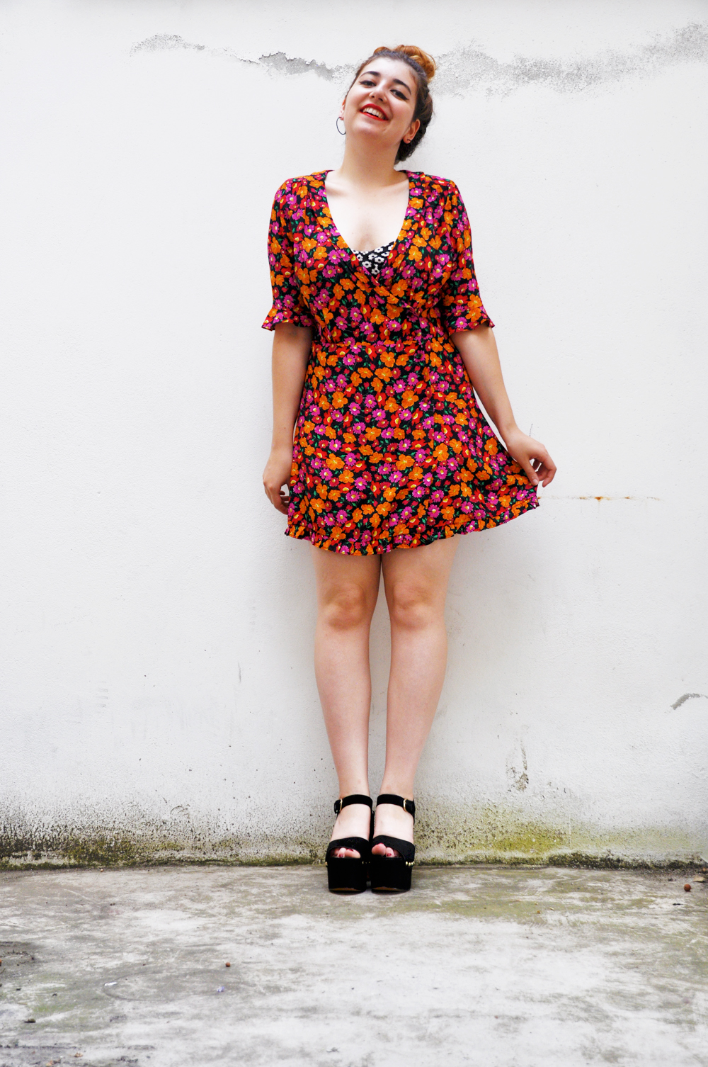 Pour remédier à ce décolleté plongeant qui me déplaisait je me suis dit qu'il fallait que je porte quelque chose en dessous qui me couvrirait un peu (à me lire j'ai l'impression d'être une nonne). J'ai donc pensé à cette brassière à fleurs que j'avais acheté chez Forever 21 en 2014 (look à voir >> ici <<). J'ai essayé les deux ensemble et j'ai beaucoup aimé le mélange des différents motifs. Bon je ne vous le cacherais pas, je trouve ça encore très plongeant haha.